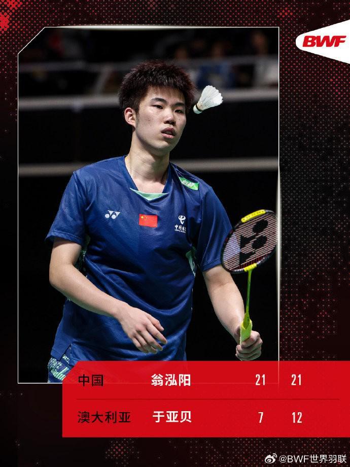 另一位中国选手翁泓阳2-0(21-7、21-12)横扫澳大利亚于亚贝,晋级第二轮。下轮对手将是中国台北李佳豪和意大利托蒂的胜者。